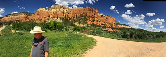 We go to northern New Mexico for its unique light and landscape. To us, the clarity of the brilliant light seems different from that of most other places we’ve had the opportunity to paint. The 6,000-foot elevation of Abiquiu accounts for some of the light quality. There is just less atmosphere to diffuse and scatter light up there. What atmosphere there is, is bone dry so that everything near and far stands out in sharp focus. Against an impossibly blue sky peppered with towering clouds, the topography and rainbow colors of the surrounding mountains, mesas, plateaus and escarpments create the special light the area is famous for.