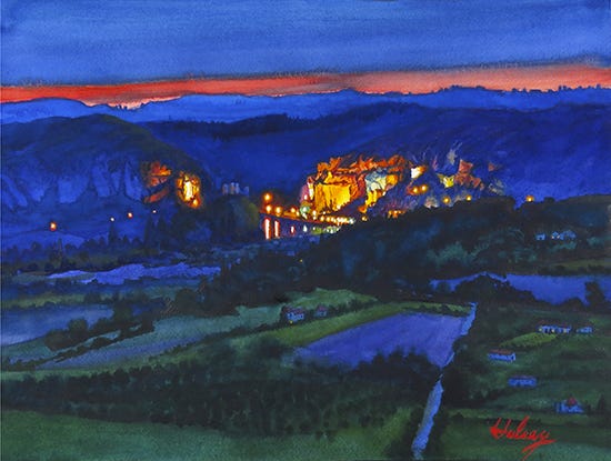 Sometimes when we are traveling, we see things that we are moved to paint, but for one good reason or another cannot. My reference image for this painting was taken at night from an overlook high above the Dordogne River in France. We were staying in the little village of Domme, perched on the edge of a cliff carved out by the river. As night began to fall, I was struck by the fading dusky light in the sky, the lights of the village of LaRoque Gageac and the deep tones in the landscape below. I especially liked the combination of colors, but knew that there was no time to create a watercolor en plein air before it all went dark. I set my camera on a tripod and made four or five bracketed exposures, just to be sure. This is always a good idea, because the image in the little LCD screen on the back of most cameras doesn’t display the image you are actually taking. It is a case of What-You-See-Is-Not-Necessarily-Wh…