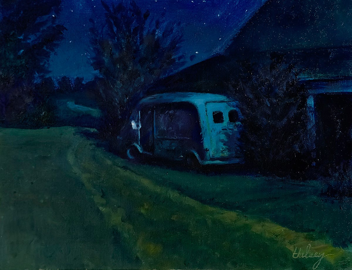What happened next cemented the relationship and added Prussian permanently to my household. On a hunch, I decided to tone my entire Nocturne canvases with Prussian and a little Galkyd medium before I drew on my composition. This was risky. Prussian gets into everything, like ink in water. Any colors laid into a wet layer of it are changed forever. I had to learn how to paint in a new way to get these color marriages to work. This was exciting. With that tonal layer, the sky was all in, and a little wiping back created that city-lights glow on the horizon. Now that the entire picture was wedded to the same cool dark, anything added over the top would be harmonious and night-like. The deep shadows were also finished. All that was left were the mid-tones and a highlight, only three more steps of value. And when it comes to dark, blackish cool greens, Prussian mixed with a touch of Yellow Ochre or Cadmium Yellow Medium says it all. Prussian Blue is the queen of Nocturne colors.
