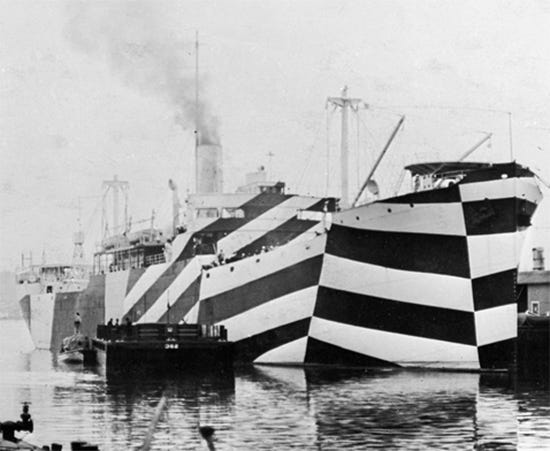 British artist Norman Wilkinson (1878 - 1971) is credited as being the inventor of dazzle painting, or razzle dazzle, during World War I. Wilkinson was a prolific illustrator and maritime painter. During the war, he was assigned to submarine patrols and mine-sweeping at a time when German submarines were successfully sinking multiple British ships every day. Wilkinson’s brainstorm was not to try to camouflage the ships, but rather to create optical confusion. He wrote that a ship should be painted “not for low visibility, but in such a way as to break up her form and thus confuse a submarine officer as to the course on which she was heading”.