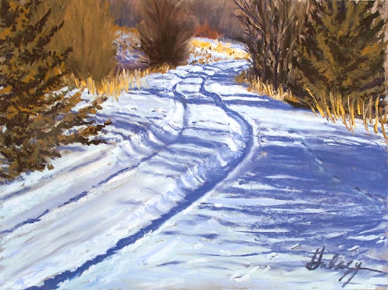 We have been getting a surprising number of comments about our recent posting of the plein air pastel, Tracks. This painting has apparently struck the same chord with others that the subject struck with me while looking around outside for something to paint this week. I think that what people are responding to is the winter light and the way colors are massaged in the painting to bring out warmth in the landscape. In particular, with the high contrast conditions of winter sun on brilliant snow, we have been exploring the colors of snow and shadows. Shadows create the form and interest in winter landscapes. “Warm light = cool shadows“, “cool light = warm shadows” are two basic principles that we use to guide our color decisions when painting outdoors. But what is meant by cool or warm light? Generally speaking, North light from a clear blue sky is going to be a cooler temperature than light measured from the South. But…