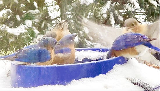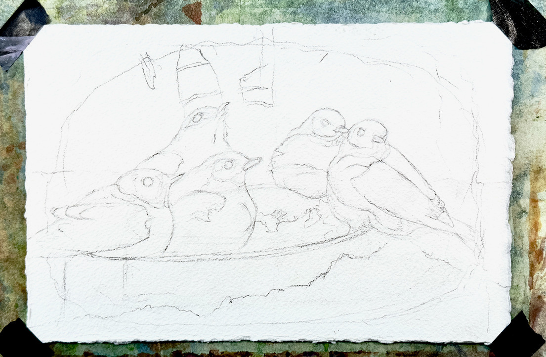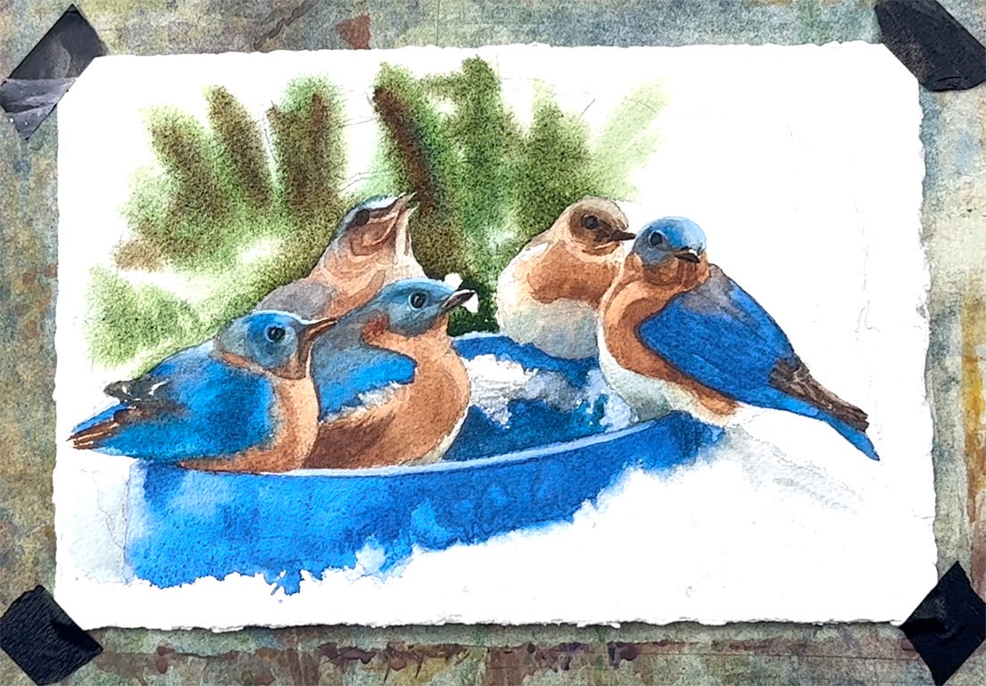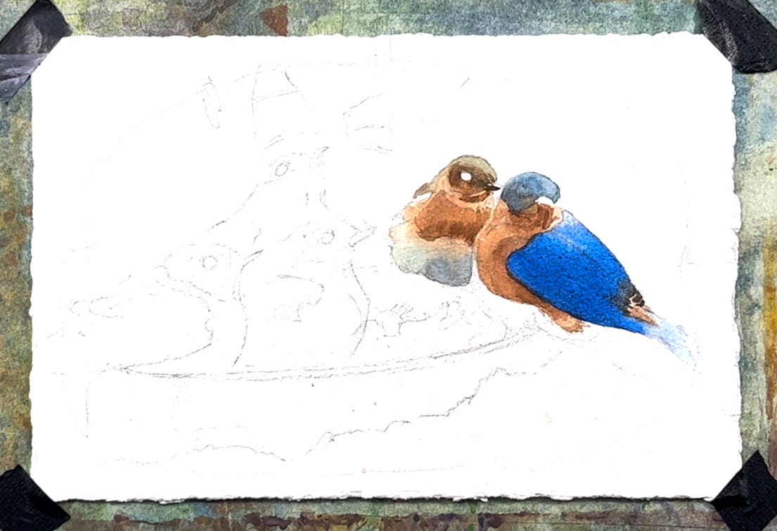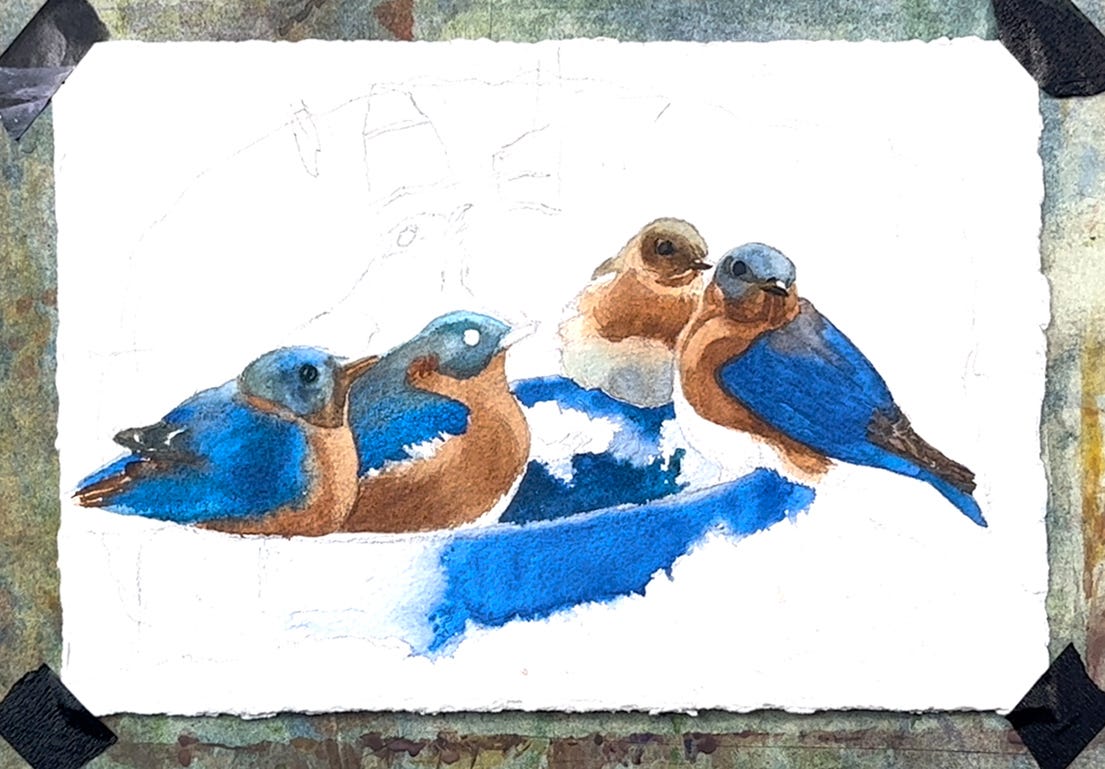 Fortunately, we live in a forest, so the wildlife is abundant and active, especially the poor birds who contend with wind and extreme cold. To help with that, we have several seed and suet feeders out, and this helps keep our populations healthy through the winter. As important as food, though, is an unfrozen water source. We put a heated dog water bowl on top of a snow-filled birdbath about 5 feet from our windows downstairs and the birds flock to it throughout the day. This year, we were thrilled to see that the bluebirds were back and using that water. We tried to draw them as they came and went, but they move away too quickly to get any poses done. In this event, it is useful to use a camera to take rapid fire photos which can be edited later. I chose one to make a watercolor study, thinking I might create a larger, 20 x 30 inch version if it worked well. This is a great way to keep working from Nature even in the toughest weather.