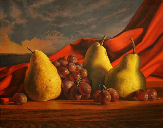 Combining a passion for painting interior spaces, still life set-ups and the landscape can lead to some fascinating glimpses into artists’ studios, living spaces and views. We have had the opportunity to interview several contemporary artists known for their paintings which give us an eye into their lives. James Borger is one of these. His whimsical still life creations are often placed in front of windows showing the serene Flint Hills landscape of Kansas. He calls these paintings, “Stillscapes”.