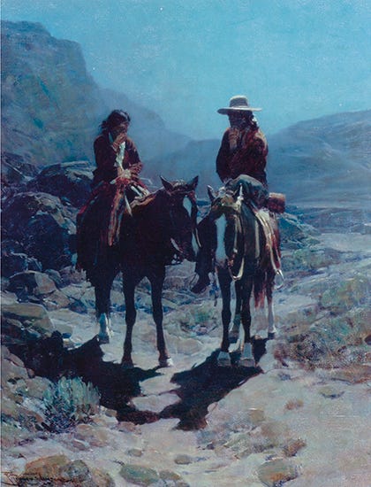 There is an otherworldly magic in a moonlit scene. We love to paint at night under the moon’s steady, cool glow. Perhaps the best known modern painter of moonlight in American art was Frank Tenney Johnson, 1874 - 1939. Johnson studied painting under William Merritt Chase, Robert Henri and John Henry Twachtman in New York. He began his career as an illustrator, painting outdoor scenes for Field and Stream magazine. He soon convinced the editor of Field and Stream to send him west on extensive trips where he would gather the reference materials for his paintings for the magazine. These paintings were so successful that it was not long before he was also illustrating book covers for western novels, notably the Zane Grey books.