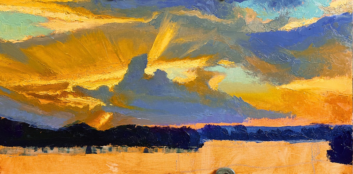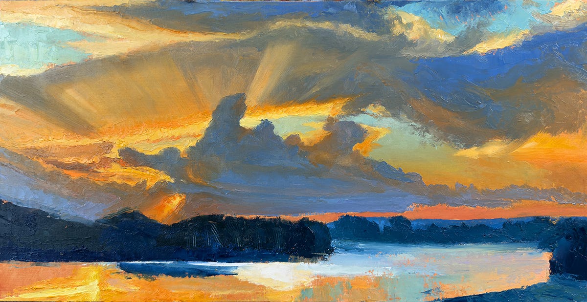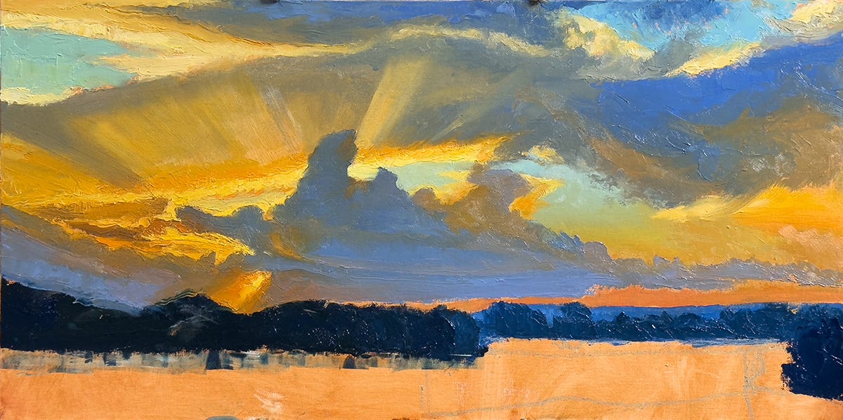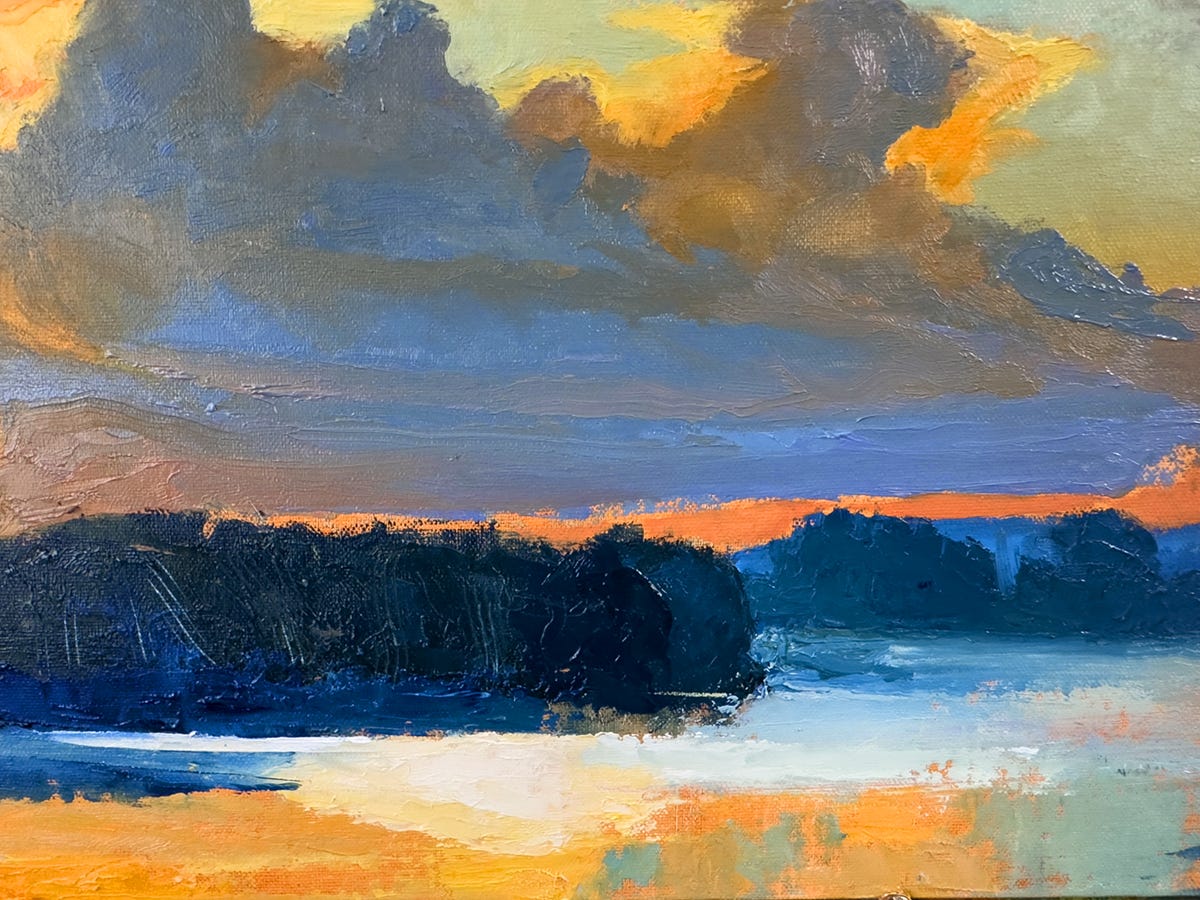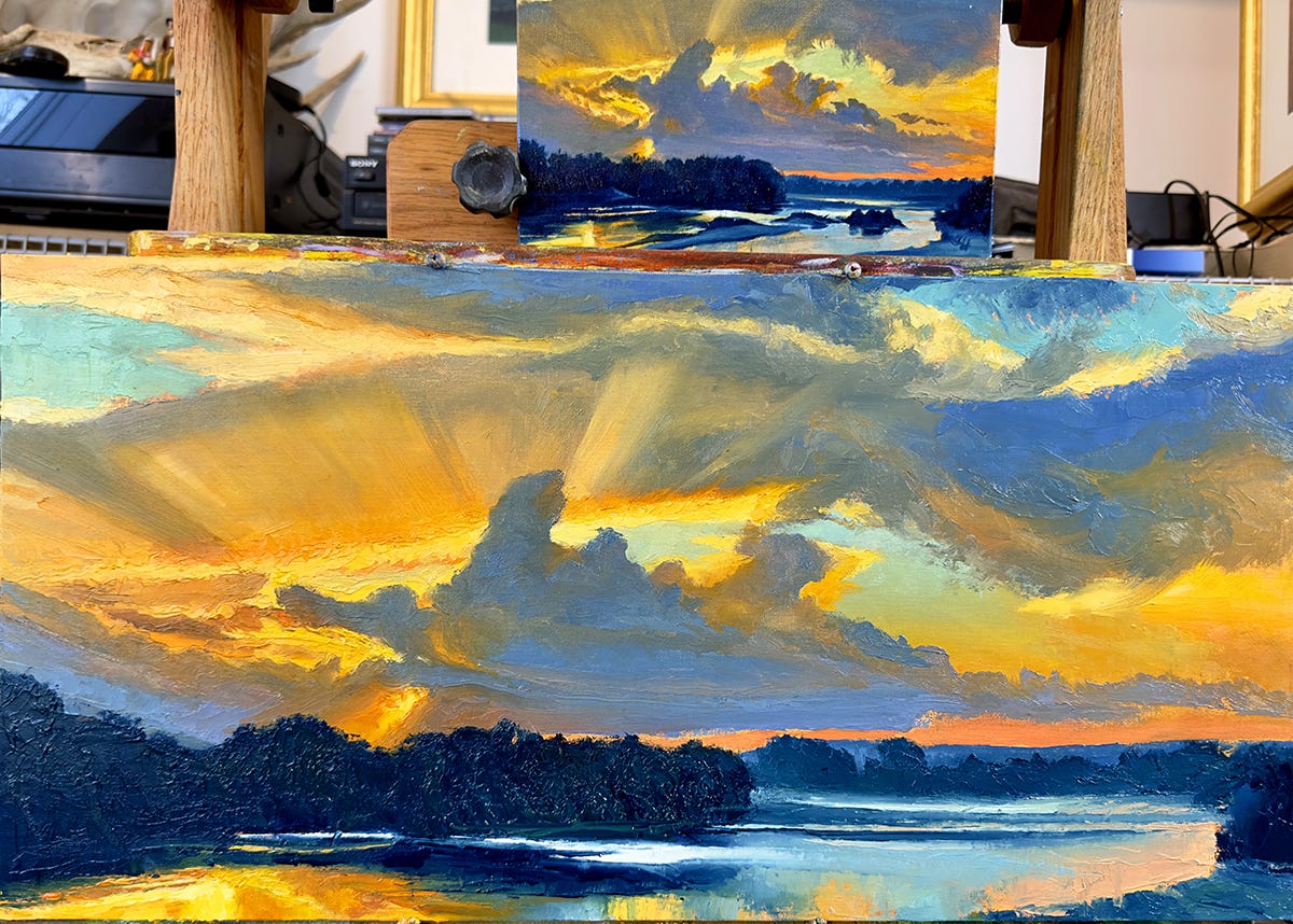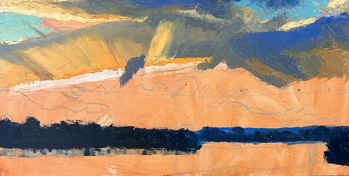 Fast forward 1200 miles and forty-two years, and I’m still fascinated by landscape in general, rivers in particular. This set of images is from the development of a recent 12 x 24” oil, The River Crossing, using painting knives. I started with a 6 x 9” oil study.