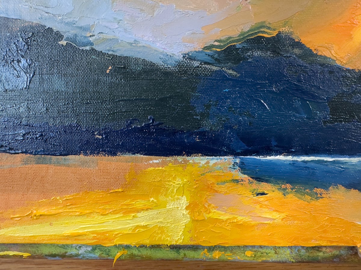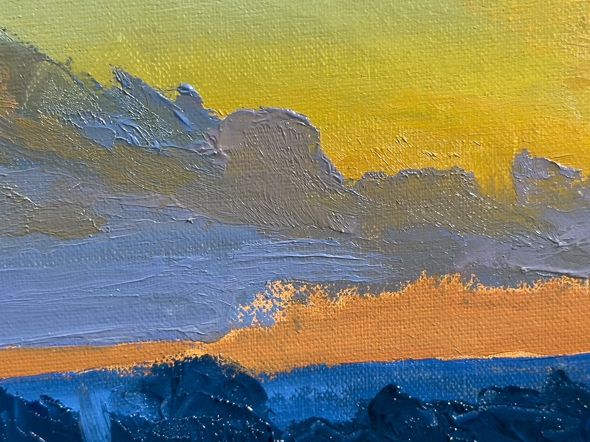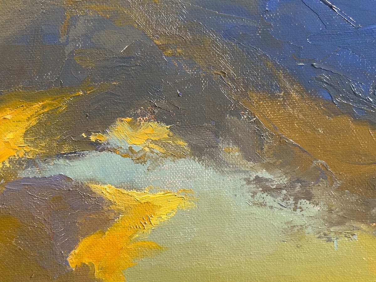 To bring it to a finish, I concentrate on all the smaller shapes, adding touches of color over existing colors, softening here and there, sharpening any edges that might have gotten lost. The result is a realistic landscape which, when looked at up close, has a very tactile, almost abstract surface. The best of both worlds.