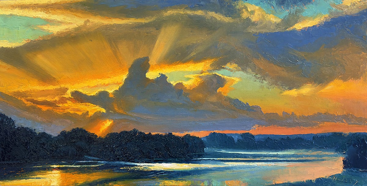 At this point I am softening and blending a few areas before the wet paint stiffens up. I prefer not to use a brush for blending unless a knife just won’t create the effect I need—like those sunbeams as they disappear. (Don’t tell anyone). As you can see, already this painting is getting some real presence.