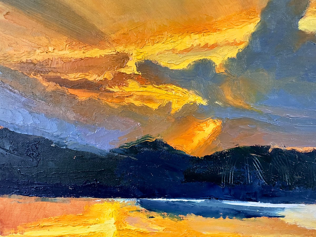 I am often roaming the countryside and the country itself, looking for landscape inspirations. It’s a great job. When I bought my first car, an Austin-Healey Sprite, I drove that fun, but horribly unreliable thing, all over the back roads around Kansas City and beyond. I loved to explore and see new places—had an unquenchable thirst for it—still do. But my art practice didn’t shift to landscape painting until a decade or so later, when I was living on the incredibly scenic Hudson River, right across that river from West Point Military Academy. My studio then was in a New York Central train station which had been a movie set in Barbra Streisand’s 1969 film, Hello Dolly. It sat on a park on the edge of the river. Each day, as I created art for book covers and magazines (remember those?), I looked out my windows at the river, longing to be Out There. So, one day I quit that work and went outdoors to really learn how to paint. I never looked back.