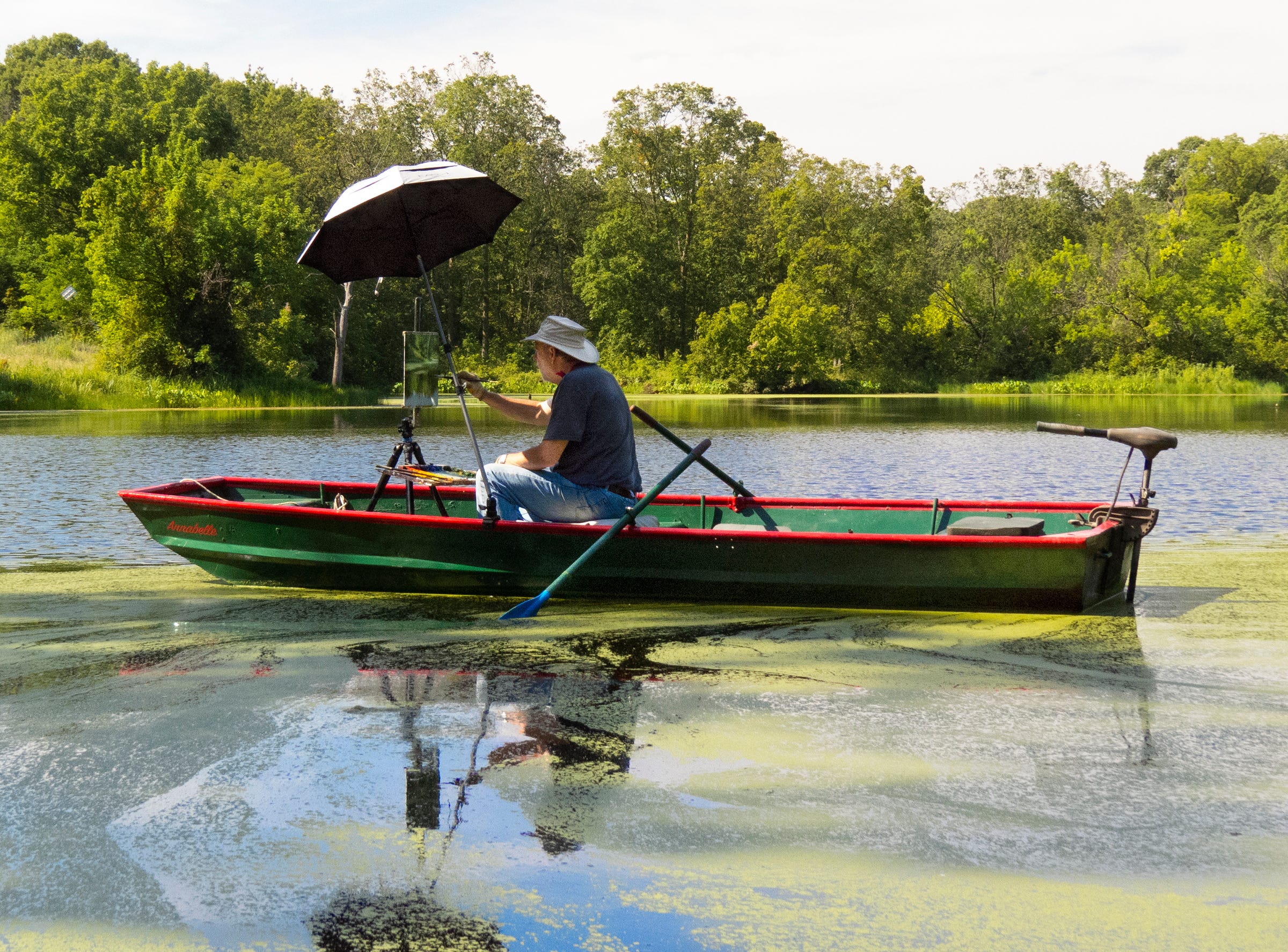Shortly after moving to Argenteuil in 1871, and inspired by his friend Charles-François Daubigny, Claude Monet purchased a boat which he converted to a bateau-atelier, or studio boat, so that he could paint the views and reflections from on the water. The ethereal views of the Seine, Oise and Epte rivers that he painted are some of his most loved paintings today. His example inspired me to buy a used jon-boat to serve as my own modest outdoor painting studio when I work on the large pond near my studio. After a thorough scrape-down and repaint, I named the boat after my nickname for my wife: “Annabelle”. The boat is now equipped with an electric motor, oars, two anchors and a pair of swivel seats, but actually has built-in seating for five people, plus dogs. It has a flat bottom and when anchored fore and aft, is …