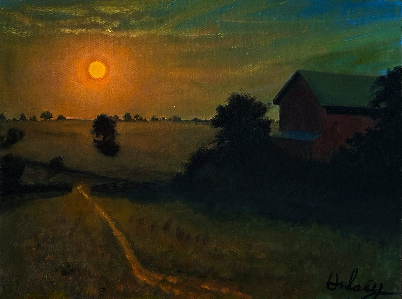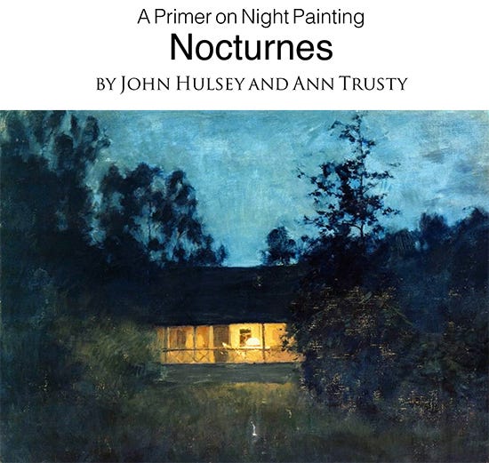 What is required is some experience painting at night, familiarity with the colors and mixes of the nocturne palette, and a spirit of adventure! We recommend that one gets everything prepared ahead of time—a small 9 x 12 inch primed panel works great. Load up with the colors you’ll need. One can find everything you need to know in our downloadable ebook, Nocturnes: A Primer on Night Painting. If the weather here is clear, we will be out there, bundled up and having a delightful time painting and drinking hot chocolate. Send us images of your efforts. We’ll display them in a follow-up article for everyone to enjoy. Who knows—your work might inspire someone else to give this a try! Wouldn’t that be lovely?
